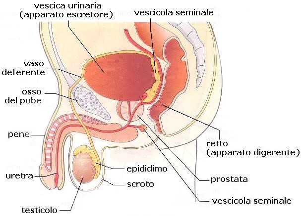 Prostata: è una ghiandola posta dietro la vescica che produce un liquido in cui sono presenti varie sostanze che costituiscono, insieme a quelle prodotte dalle vescicole seminali, la parte liquida dello Sperma.
